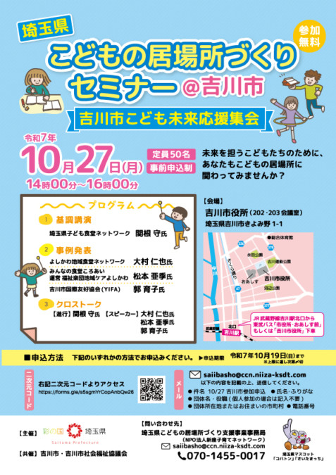 吉川市の未来のため 誰もが安心できる街に よしかわ地域食堂ネットワークとは 吉川市の地域食堂が合同となり設立された団体です。吉川市における地域食堂やフードパントリー事業の支援を行う事により誰もが安心して暮らすことができる街を目指します。 \ 新着情報 / 2025年10月14日 吉川市こども未来応援集会 未来を担うこどもたち… 続きを読む 2024年3月1日 WEBサイトオープンのお知らせ 平素より当団体に関し… 続きを読む 吉川市内の地域食堂 みんなの食堂 ころあい 毎週月・水曜日午後4時から6時まで吉川市吉川団地1街区7号棟107 ここをクリック みんな食堂 たんぽぽ 毎週土曜日午後5時から7時まで吉川市中央3-27-13 ここをクリック よつば食堂 毎週金曜日午後4時から7時まで埼玉県吉川市大字川野75-2 ここをクリック 応援してくださっている企業、団体のみなさま よしかわ地域食堂ネットワークは、SDGsの推進、目標の達成にも貢献します。